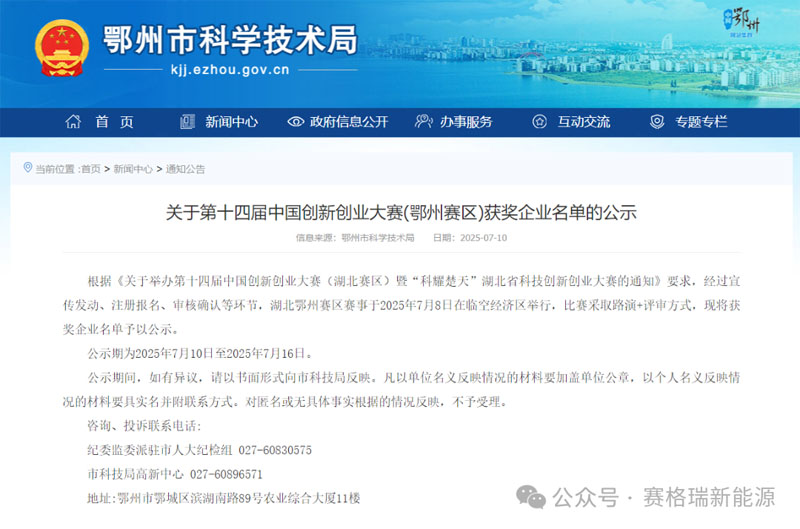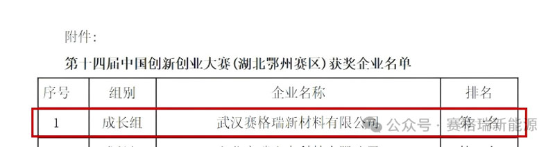 热烈祝贺武汉赛格瑞新材料有限公司在第十四届中国创新创业大赛(湖北鄂州赛区)中,从众多优秀企业里脱颖而出,荣获成长组第一名的佳绩!
